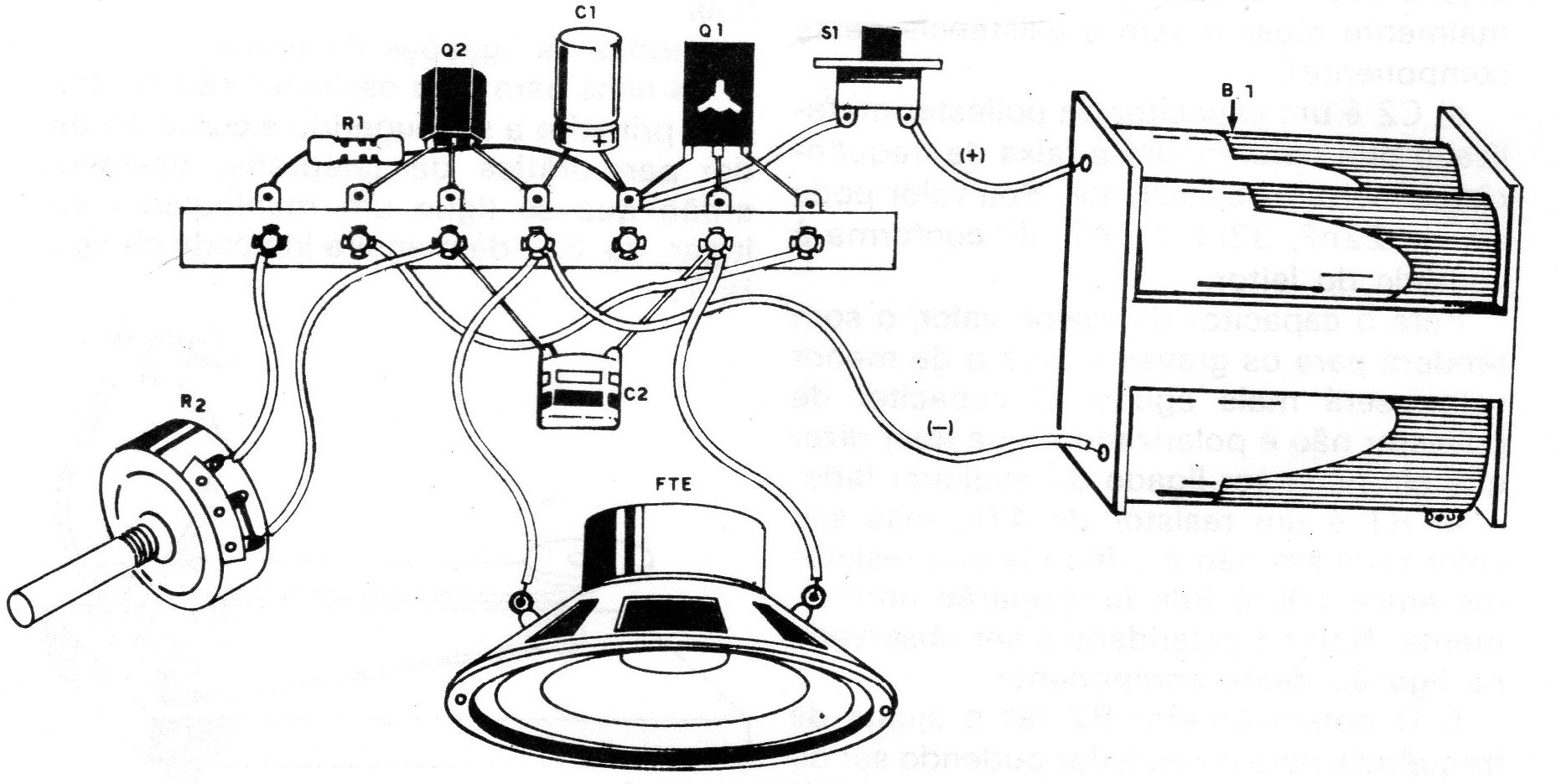 La alimentación del circuito puede ser hecha con tensiones a partir de 3 V estando el máximo en torno de 12 V caso en que el montador, conforme el transistor que se utilice en Q2 debe verificar si hay calentamiento excesivo del mismo, montándolo en disipador de calor si es necesario (figura 4).