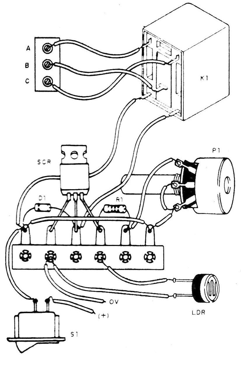 Utilizando un SCR en lugar del transistor podemos hacer una alarma de corte de luz con traba, o sea: cuando la luz es cortada el relé dispara y así permanece aunque la luz sea restablecida en el LDR. El circuito es muy sensible y puede ser utilizado como alarma, en demostraciones y en muchas otras aplicaciones, tales como un sensor de falta de luz con "memoria".