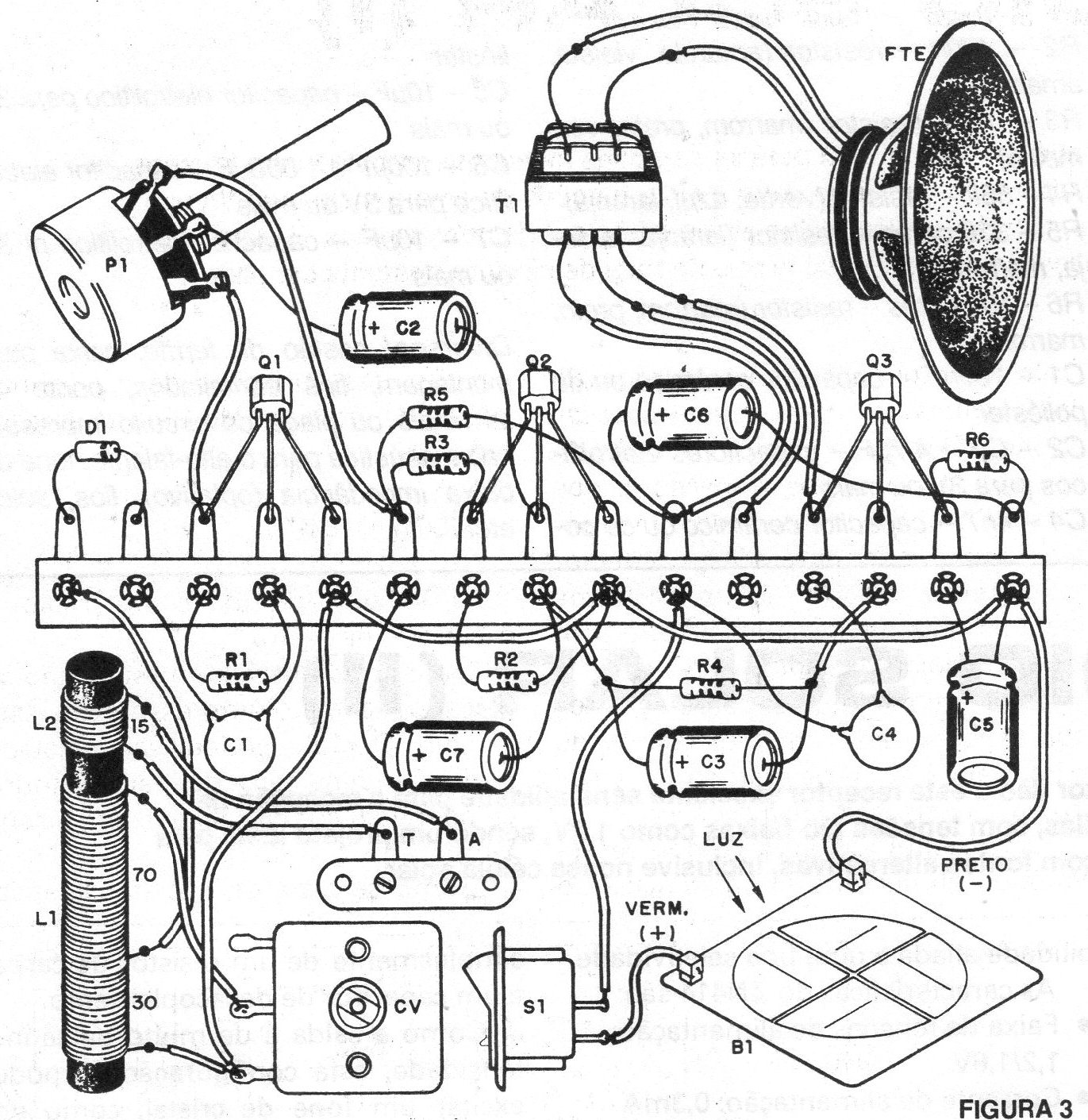Para reunir buena sensibilidad, escucha en altavoz y alimentación con baja tensión (entre 1,2 y 1,8 V), hicimos un circuito amplificador con 3 transistores de alta ganancia.