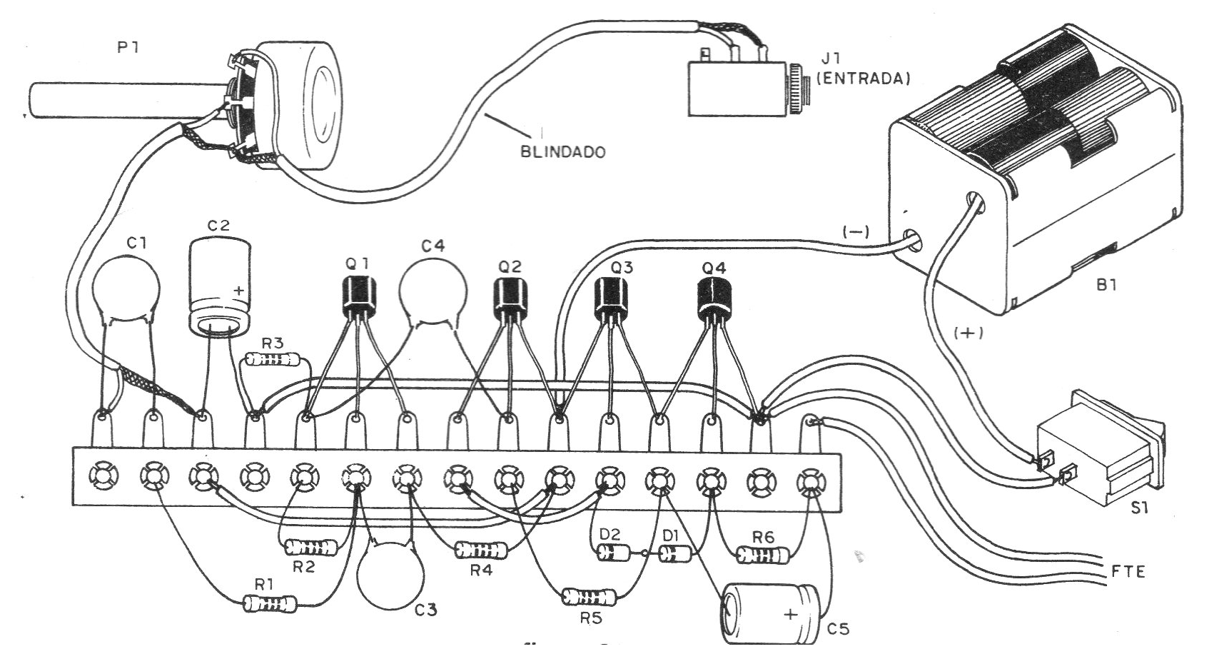 h) La conexión del potenciómetro a la entrada y al amplificador debe realizarse con cable blindado, para que no haya captación de zumbidos. La malla del cable blindado debe conectarse al punto común de tierra del amplificador, que corresponde al polo negativo de la batería.