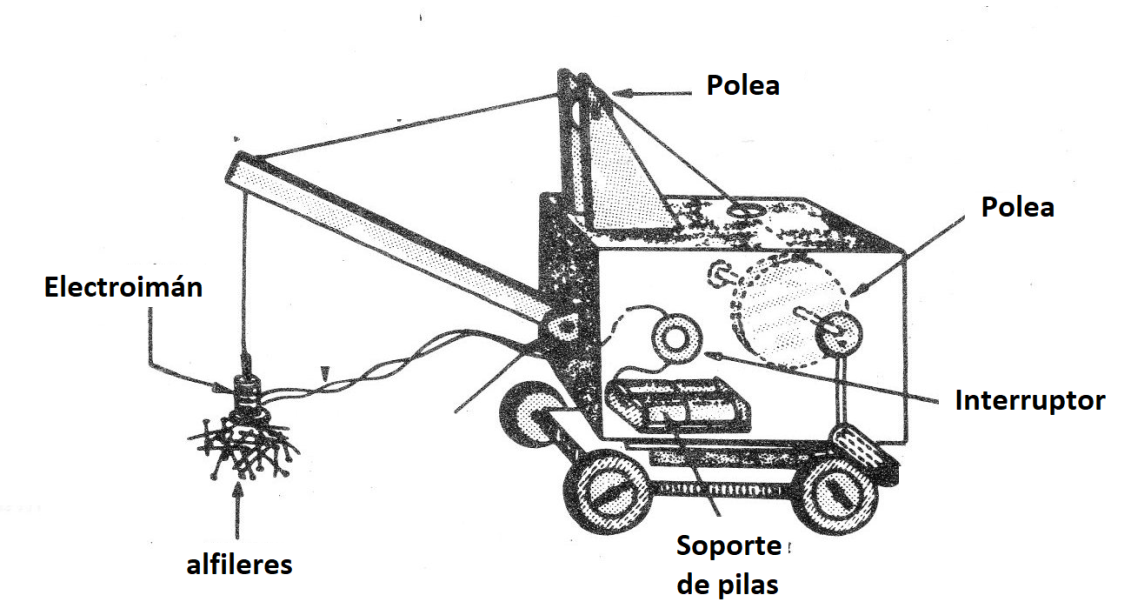 Un juguete interesante que se puede realizar a partir de este electroimán consiste en una pequeña grúa alimentada por pilas capaz de levantar pequeños objetos metálicos como clavos, alfileres, arandelas, etc. En la figura 3 tenemos una sugerencia de cómo se podría hacer.