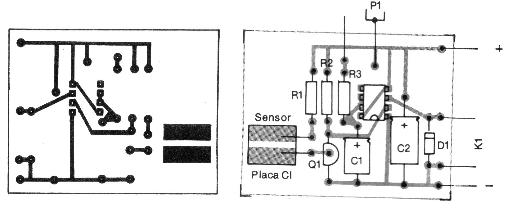 En la figura 2 tenemos una sugerencia de placa de circuito impreso para el montaje, usando relé con zócalo DIL.