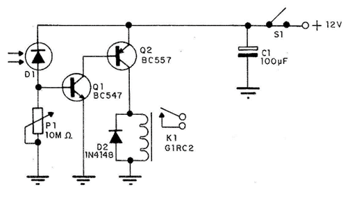 El relé es de 12V, que puede ser el G1RC2 que puede controlar hasta 10 amperios de cargas. La sensibilidad se puede ajustar conectando un potenciómetro de 10 Megaohms entre la base de Q1 y el punto 0V de la fuente de alimentación.