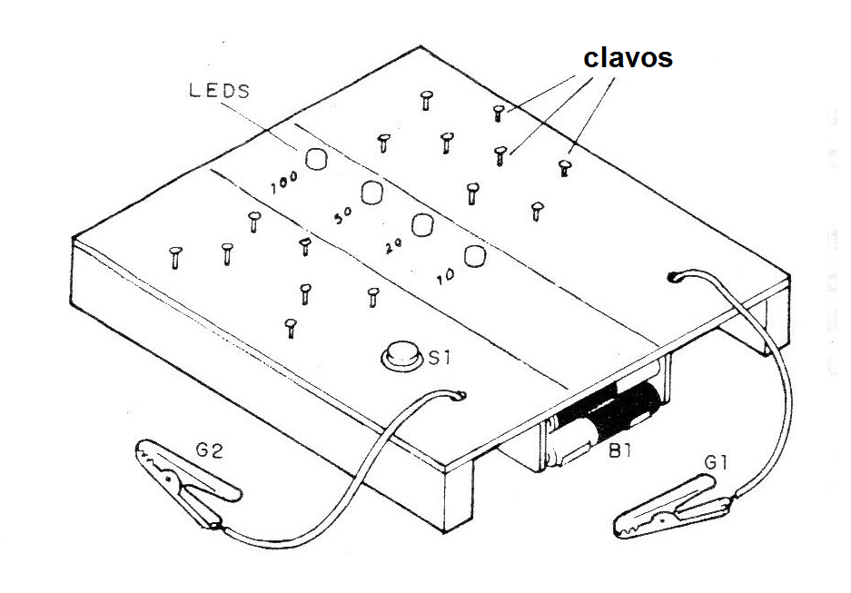 Los clavos son vistos por debajo, es decir, deben ser tomados por encima del tablero de modo que sus puntas queden salientes abajo, donde son soldados los diodos.