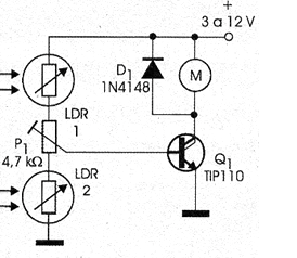 La segunda versión de un control foto-eléctrico (por luz) de un motor usando un transistor Darlington se muestra en la figura 1. (La primera es MIN508S)