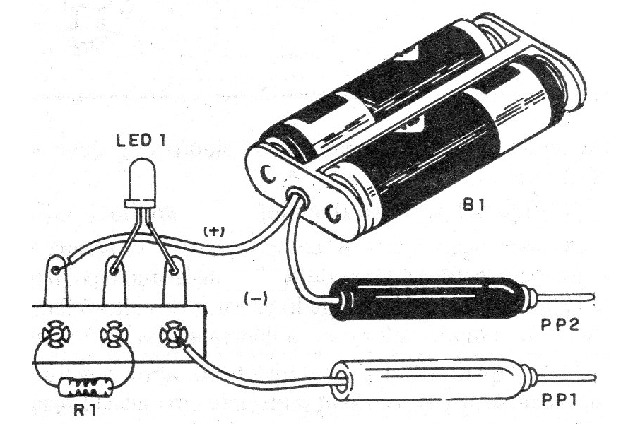 Las puntas de prueba se construyen con dos puntos medios en los que se soldán los hilos de unión y luego aislados con cinta aislante común.