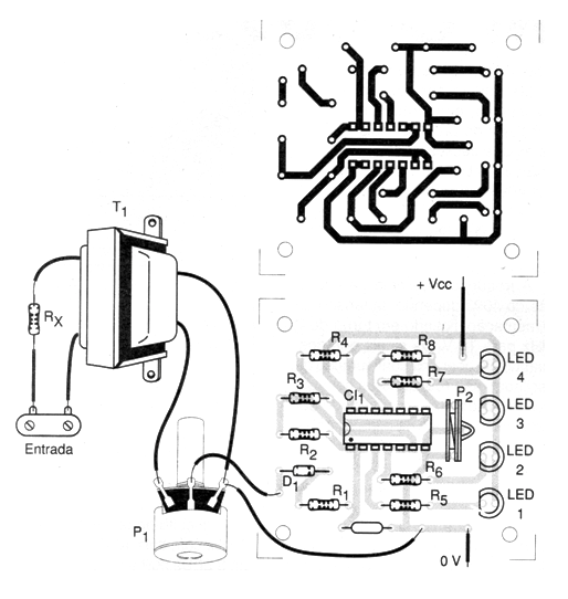 El circuito puede ser adaptado para operar con 2 4093 y así accionar hasta 8 LED en una escala. En este caso, la red de resistencias de entrada debe adaptarse.