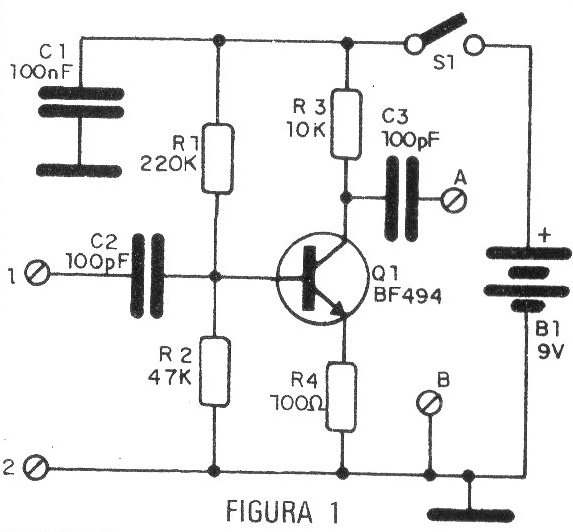 Este reforzador de señales permite mejorar la recepción de su radito de ondas medias y cortas (no funciona en FM). Conectando el punto 1 a una buena antena externa de al menos 10 metros de longitud, y el punto 2 a la tierra, aplicamos la señal a la entrada del transistor Q1 que es un amplificador de RF.