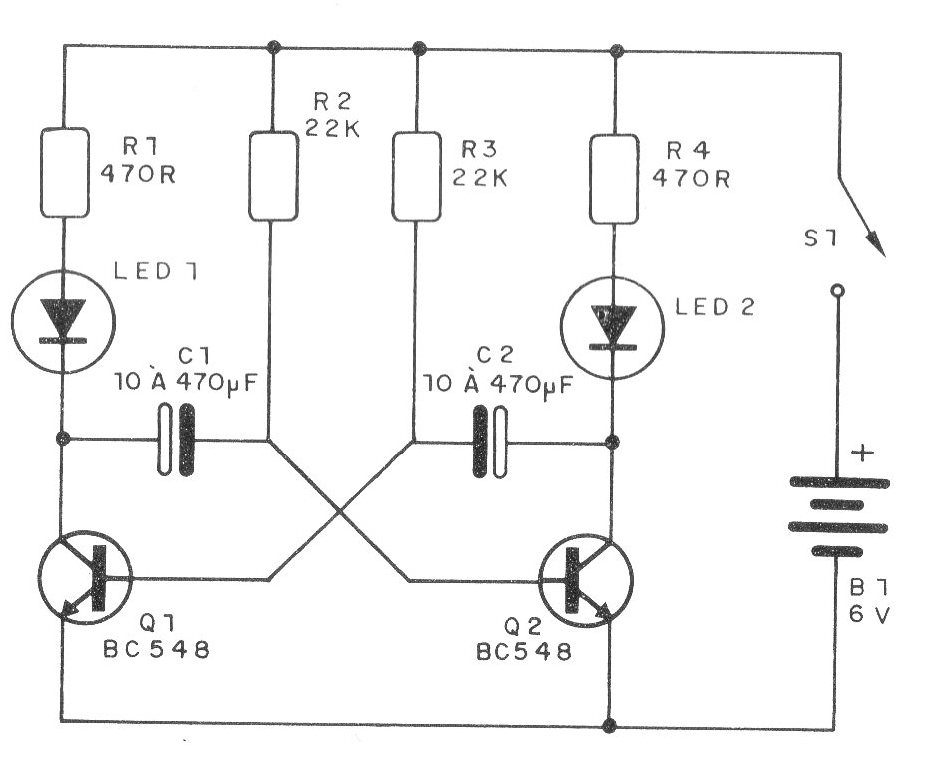 Los LED usados, que pueden ser ambos rojos o de otros colores, parpadean alternativamente a una velocidad que depende de C1 a C2. El lector puede elegir los valores según desee parpadear más rápido o más lento.