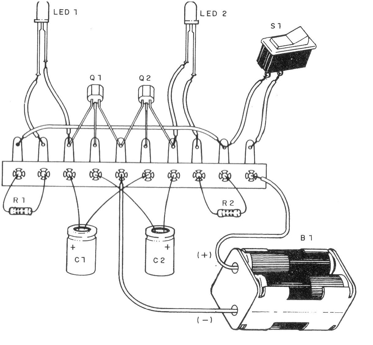 En el montaje será necesario observar la posición de los LED y de los transistores así como la polaridad de las pilas y de los electrolíticos C1 a C2.
