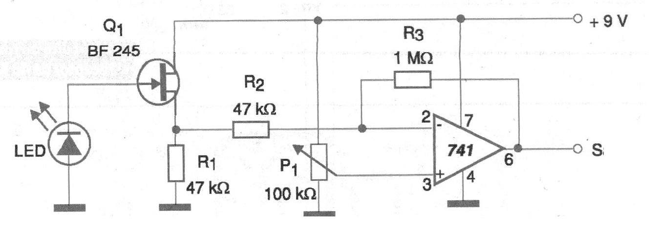 Con este circuito es posible utilizar un LED común como foto-sensor para radiación modulada, en un enlace óptico, por ejemplo. La frecuencia máxima es del orden de algunos cientos de kilociclos y la sensibilidad máxima depende del color del LED.