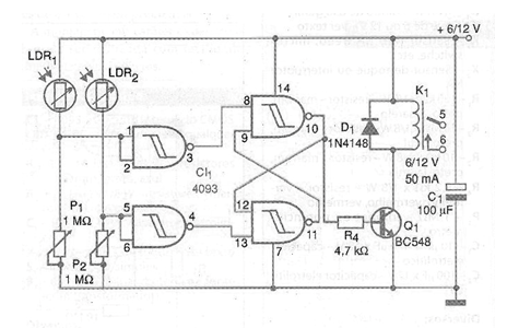 El circuito que presentamos consiste en un control foto-eléctrico con acción biestable. Un pulso de luz en LDR2 conecta el relé y un nuevo pulso en LDR1 se apaga. La sensibilidad se ajusta en los trimpots o potes P1 y P2. Los LDR son del tipo redondo común, pudiendo ser instalados en tubos opacos con lentes para mayor sensibilidad y directividad. El relé es del tipo sensible de 6 V o 12V según la tensión utilizada en la alimentación. La bobina debe tener una corriente de accionamiento máxima de 50 mA. Los cables de conexión a los sensores (LDR) pueden ser largos, hasta 20 metros de longitud. Con el aumento de P1 y P2 a 10 M ohmios se pueden utilizar foto-transistores como sensores.
