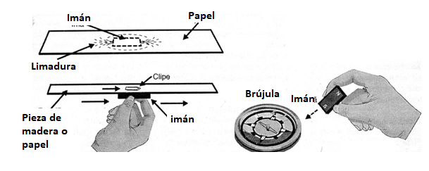 Muestre también que si el imán es movido bajo una hoja de papel, en la parte superior un clip o alfiler quedan sujetos a sus fuerzas, acompañando el movimiento, vea la figura 1.