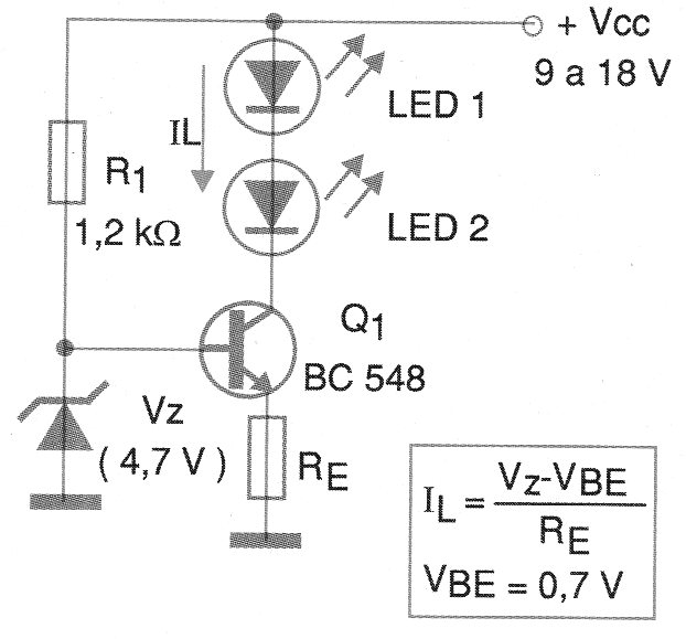 El circuito mostrado en la figura 1 proporciona una corriente constante (IL) para dos o más LEDs con el fin de realizar un transistor y un diodo zener.
