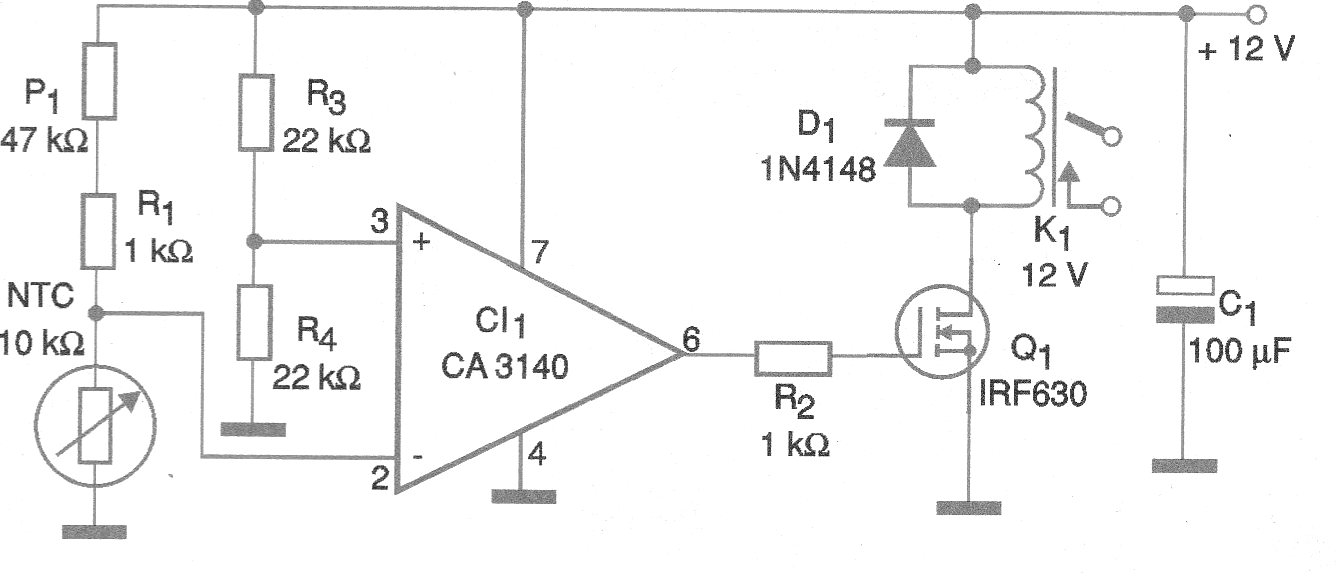 El sensor utilizado es un NTC y P1 es un potenciómetro de 47 k a 100 k que ajusta el punto de disparo del relé. En lugar del FET se puede utilizar un transistor bipolar común si el relé es de corriente hasta 100 mA.