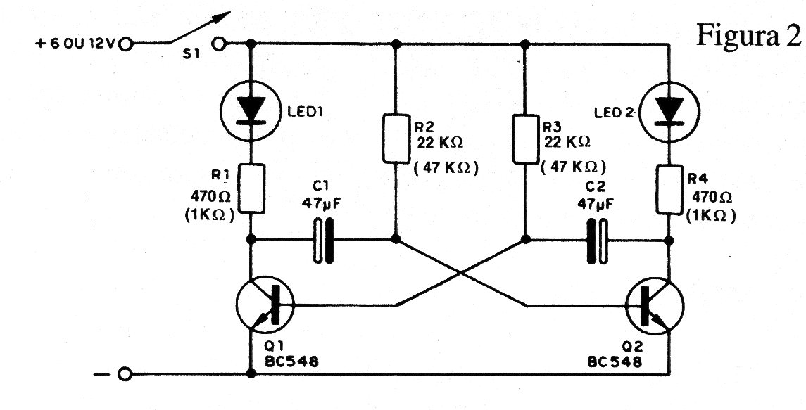 El circuito consiste en un multivibrador astable que activa dos LED en una frecuencia determinada por los condensadores.