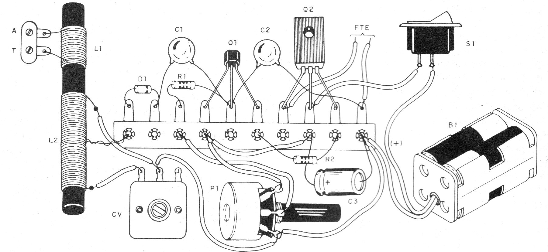 En la figura 1 tenemos el diagrama completo del receptor de dos transistores para el rango de ondas medias.