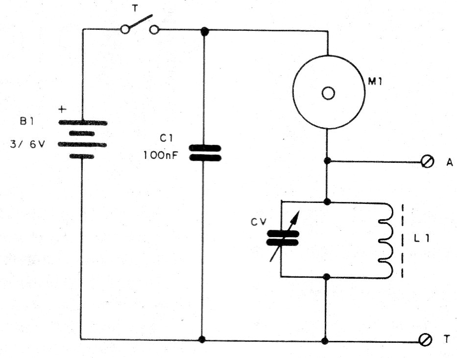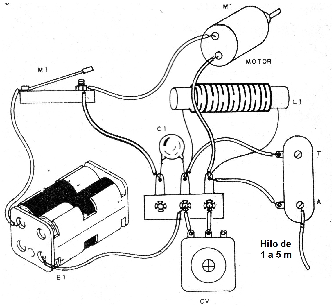 En este circuito, la conmutación de las escobillas del motor genera una señal rica en armónicos, el cual aplicado a un circuito sintonizado hace que sólo una señal de determinada frecuencia sea llevada a una antena.