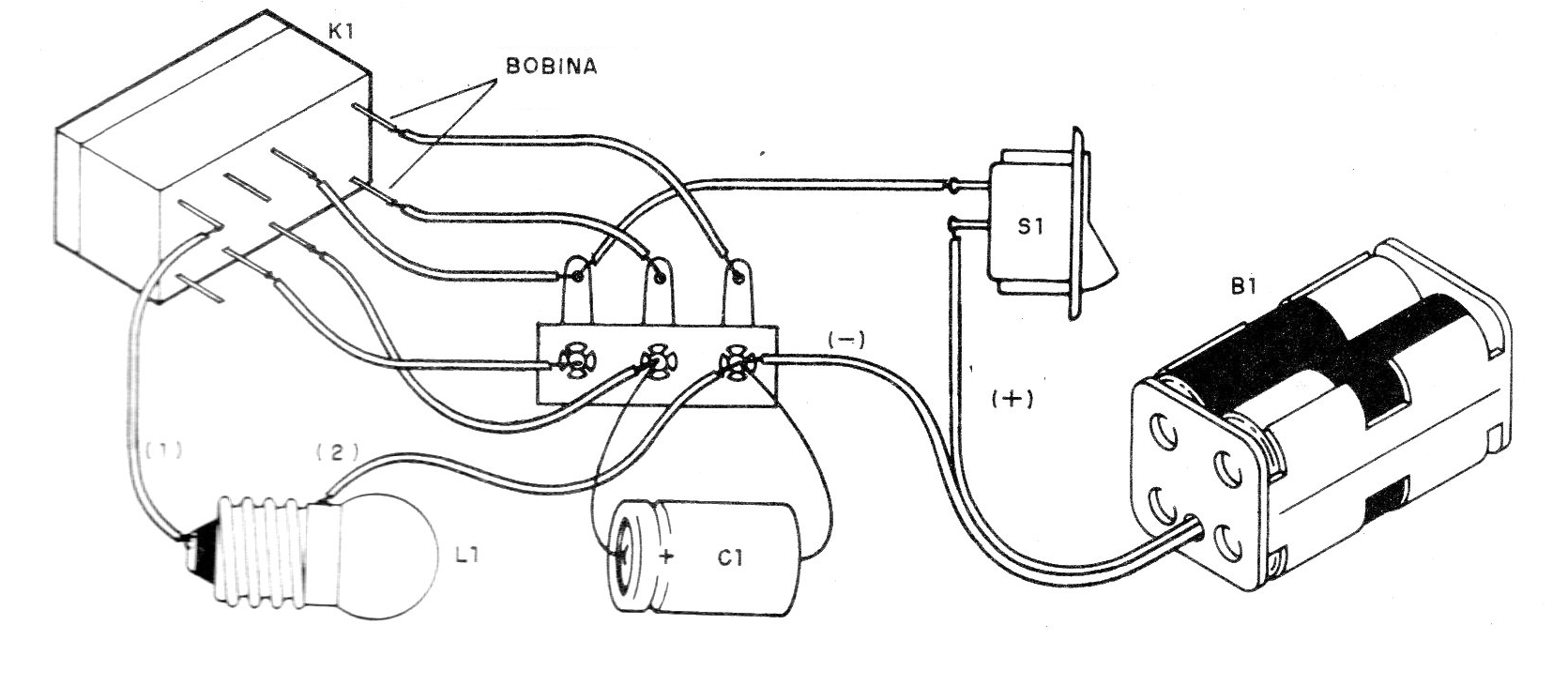 En el diseño mostramos un soporte de 4 pilas para el caso de relé de 6 V, pero el circuito puede funcionar con relés de 12 V, siendo entonces instalado en un coche o alimentado por fuente.