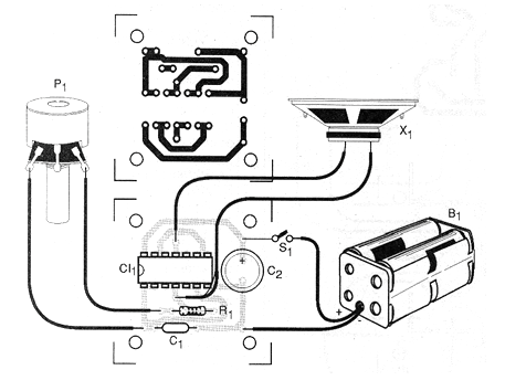 Así, tenemos dos posibilidades de uso para el aparato: usando cápsulas piezoeléctricas comunes con respuesta de frecuencia más baja, generamos sonidos. El potenciómetro o trimpot P1 se ajusta para obtener el mayor rendimiento. Por otro lado, usando un tweeter piezoeléctrico, del cual el transformador interno ha sido retirado y conectado directamente al transductor, reducimos el valor de C1 y generamos ultrasonidos.