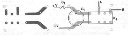 Hay situaciones en que se necesita el cierre de un relé por un tiempo corto a partir de un pulso de mando pero no se dispone de tiempo o componentes para el montaje de un circuito más complejo, usando el 555, por ejemplo. La idea práctica que damos utiliza sólo tres componentes y tiene la placa de circuito impreso mostrada en la figura 2.