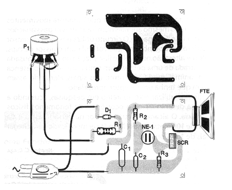 Para la red de 110V se puede utilizar el TIC106B y para la red de 220V se recomienda el SCR TIC106D. La lámpara de neón y el potenciómetro son de tipos comunes. Para el diodo D1 tenemos el 1N4004 o 1N4007 si la red es de 110V, pero si es de 220V debe ser usado solamente el 1N4007. El altavoz, de 4 ó 8 ohmios de al menos 10 cm de diámetro.