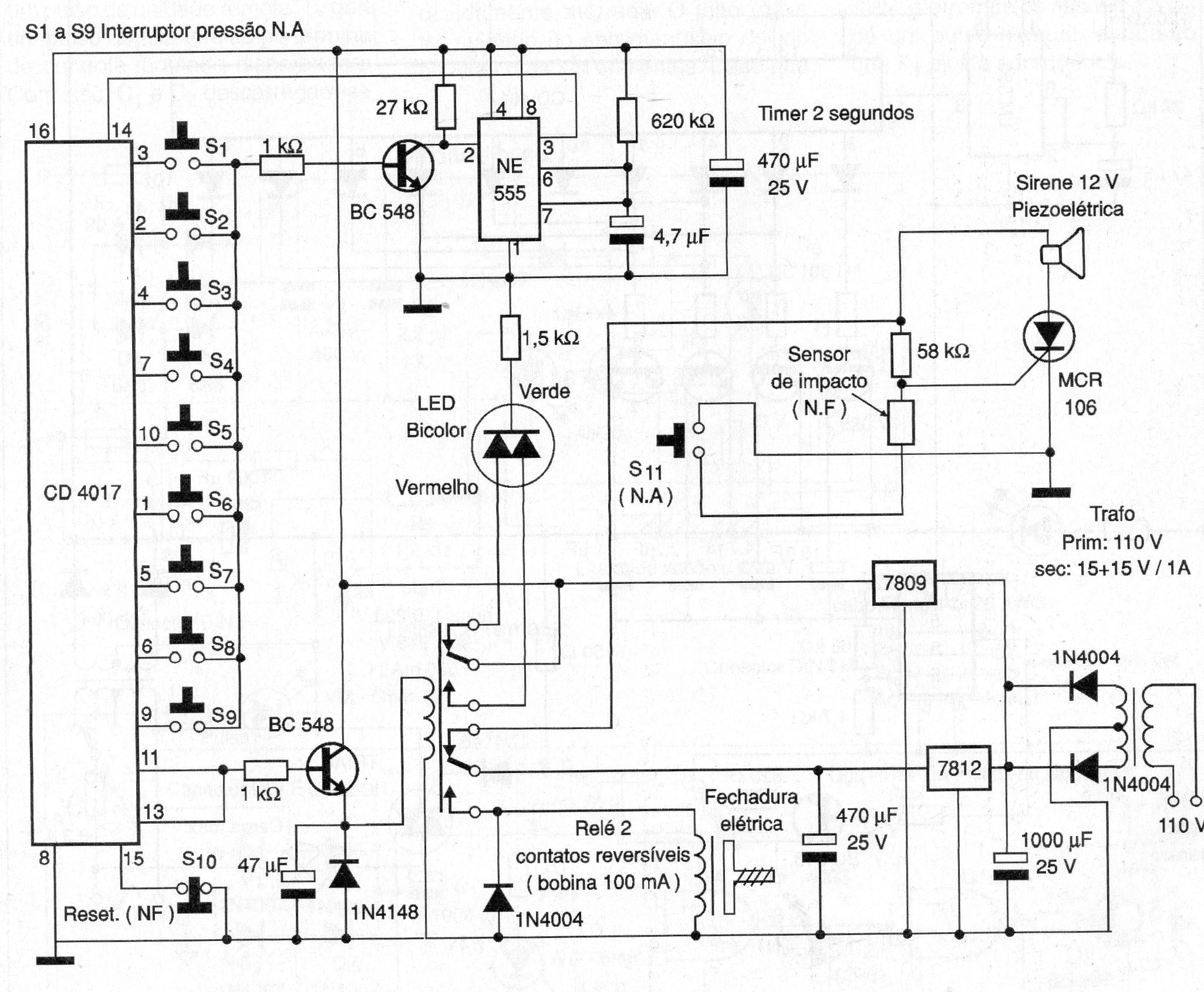 Este circuito desconecta una alarma y abre la puerta de una caja fuerte (o de acceso restringido) si la contraseña se escribe correctamente, lo que indica el LED verde. Se ha aprovechado un CI 4017 que decodifica la clave codificada con 10 teclas siendo que la última (pin 15) reseta el circuito. Observe que es un interruptor de presión normalmente cerrado. Los interruptores deben estar numerados de 0 a 9 y montados en un teclado. La última salida del 4017 está conectada al pin 13 (clock). Cuando se acciona, permanece cerrando el relé. La cerradura cuando se acciona, abre la puerta. Se utilizan dos CIs reguladores de tensión que deben ser dotados de radiadores de calor. Los sensores son: un interruptor de presión NA que debe fijarse en la puerta de la puerta para ser accionado en caso de impacto (intento de robo). Para desarmar la sirena en caso de disparo es necesario introducir el código y reset. (2006)