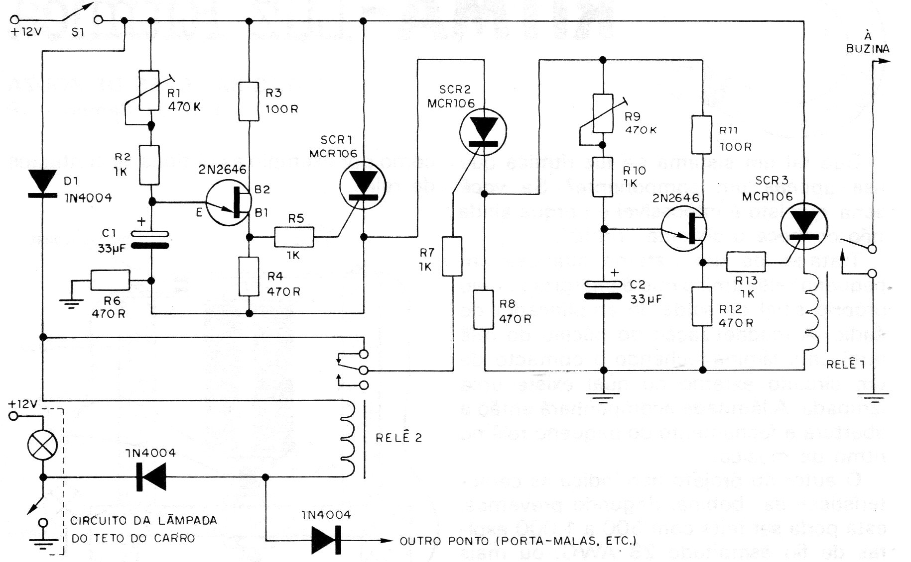 Este circuito de alarma fue encontrado en una publicación de 1982. Utiliza componentes que aún se pueden encontrar con facilidad, aunque la configuración es antigua. Los ajustes de tiempo se realizan en los trimpots y dependen de los capacitores C1 y C2.