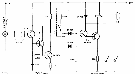 En este circuito de Texas Instruments se utiliza una lámpara incandescente como fuente de luz, y en el frente se colocan lentes para dirigir el haz sobre el sensor. El relé depende de la tensión de alimentación y los transistores pueden ser equivalentes más modernos.