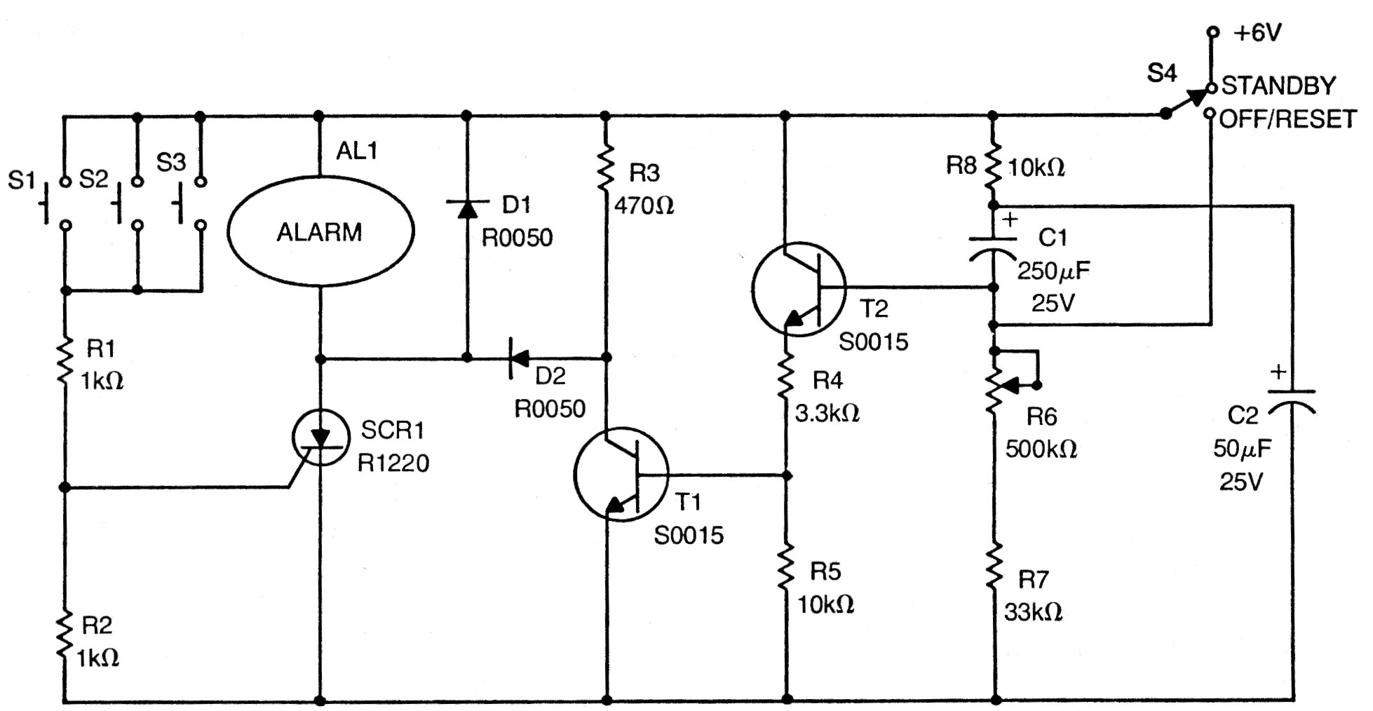 Encontramos este circuito en una antigua publicación estadounidense. Se puede montar con SCR del tipo TIC106 y transistores BC548. El circuito tiene un sistema de bloqueo que arma el circuito después de cierto tiempo. Los condensadores pueden tener sus valores aproximados por los estandarizados actuales. Sugerimos usar un relé de 12 V en lugar de la alarma y alimentar el circuito con esta tensión.