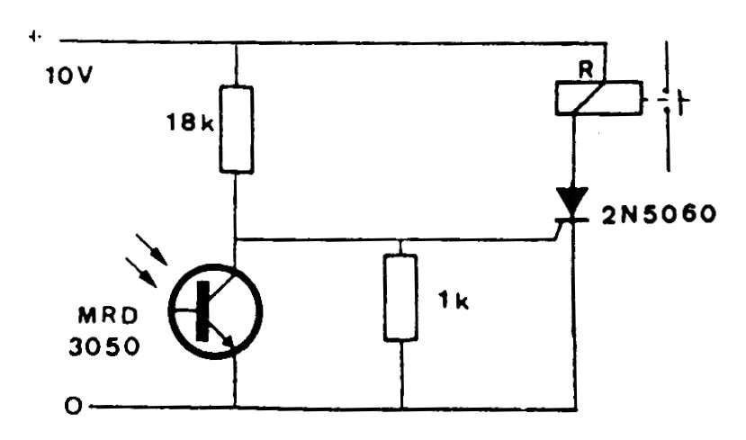 Este circuito dispara un relé u otra carga de corriente continua cuando la luz deja de incidir sobre el foto-transistor. Se puede utilizar un potenciómetro de 47k en serie con un resistor de 4k7 en lugar del resistor de 18k como control de sensibilidad.