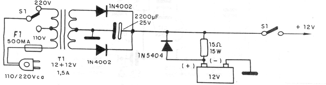 Esta fuente originalmente creada para el proyecto CIR9726, pero sirve para cualquier tipo de alarma de 12 V. El circuito proporciona 12 V a la alarma, al tiempo que mantiene una batería en carga. Cuando la energía se corta, la batería continúa suministrando energía al circuito de alarma.