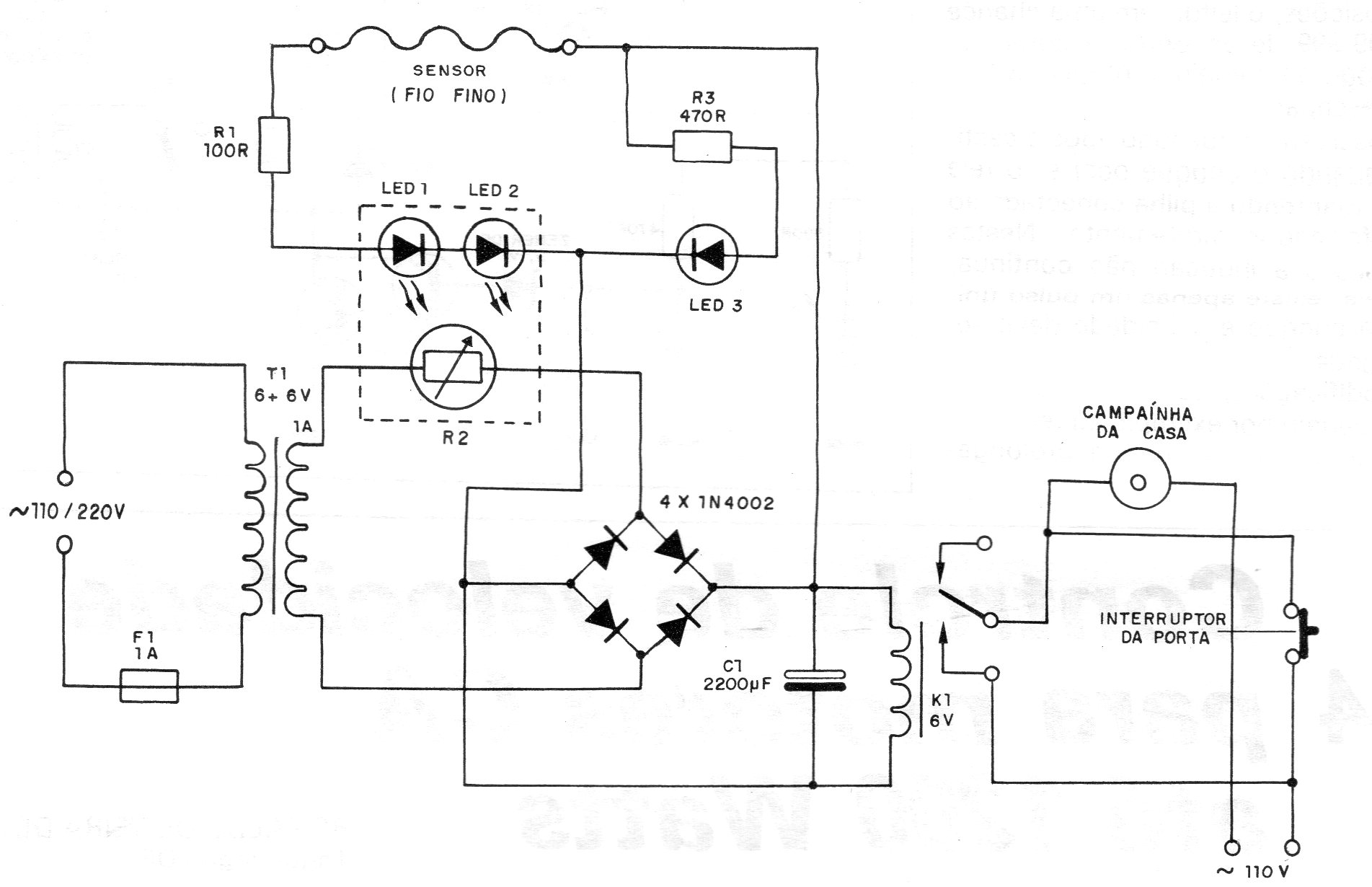 Este circuito es de una publicación de 1987, pero utiliza componentes aún comunes en nuestros días. El transformador es de 1 A con 6 V y el relé del tipo sensible de 6 V (preferiblemente un reed relé). El circuito utiliza un LDR que iluminado mantiene el relé activado. Cuando los sensores se interrumpen, el relé se desactiva y la alarma externa se dispara. Los sensores pueden ser de tipo reed o hilos finos.
