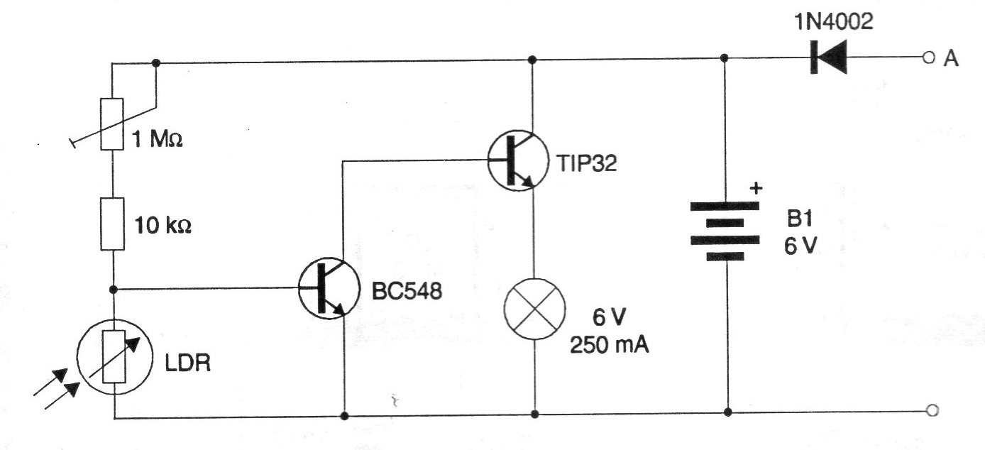 Este circuito hace encender una pequeña lámpara piloto o de linterna de 6 V cuando la iluminación ambiente es interrumpida- Sugerimos la utilización del aparato con baterías de Nicádmio que quedarán conectadas a un cargador lento permanente conectado entre los puntos A y B. El transistor TIP32 debe se monta en un pequeño radiador de calor y el ajuste de sensibilidad al disparo en función de la luz ambiental se realiza en el trimpot.