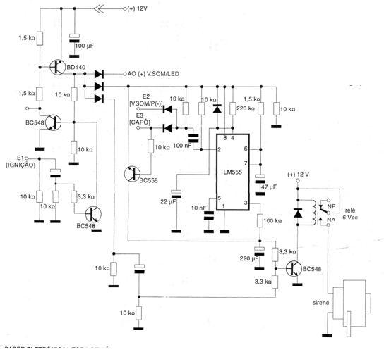 El circuito de una documentación de 1998 tiene dos bloques. Uno de ellos arma y desarma un circuito monoestable que tiene la función de disparo. El otro es la alarma propiamente dicho que se basa en un 555 controlando un relé. El circuito fue proyectado para relés de 12 V, siendo esta su alimentación.