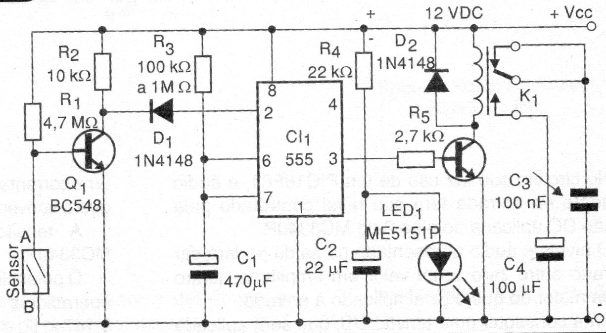 Cuando el sensor conectado a los puntos A y B se activa, extrayendo la conexión a tierra de la base de Q1 y con ello llevando este componente a la saturación, el monoestable formado por CI-1 se dispara. Este monoestable controla el tiempo de disparo del relé K1 a través de Q2. El tiempo obtenido con un resistor de 100 k ohms y un capacitor de 470 uF es del orden de 1 minuto, pero usando un resistor de 1 M ohms, llega a los 10 minutos. El resistor R4 en conjunto con el capacitor C2 conectados al pin 4 del 555 garantiza el reset automático del circuito, evitando que sea disparado al conectar la alimentación. La llave que enciende y apaga el circuito se puede instalar en un lugar oculto para activar y desactivar la alarma. Los sensores pueden ser del tipo reed-switch, micro-switches u otros. Diversos sensores pueden ser conectados en serie para la protección de puntos diferentes de una residencia u otro lugar.