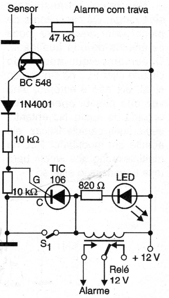 Este circuito, al ser disparado, traba y así permanece hasta que la fuente sea apagada por un momento o S1 cerrado y luego abierto. El circuito controla un relé de 12 V debiendo ser alimentado por esta tensión. El SCR no necesita disipador de calor.