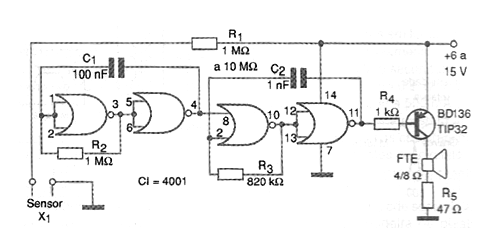 Esta aplicación consiste en un circuito que se dispara cuando la resistencia del sensor cae a valores por debajo de algunos megohms. Este valor es determinado por la resistencia R1, en el circuito de la figura. Cuando el circuito se dispara, produce un tono intermitente, generado por un oscilador como el del circuito anterior (CIR3242S). Para utilizar como alarma de agua (nivel de agua o inundación), el sensor consta de dos hilos con las puntas peladas, Su contacto con el agua o la humedad hace que la alarma dispare. Para utilizar como sensor de toque, el sensor consta de dos planchas de metal que se deben tocar simultáneamente. Una posibilidad consiste en aterrizar el negativo de la fuente y usar sólo una placa como sensor de tacto. En este caso, el hilo hasta el sensor no debe sobrepasar 1 metros, para que los ruidos captados no provoquen el disparo errático.