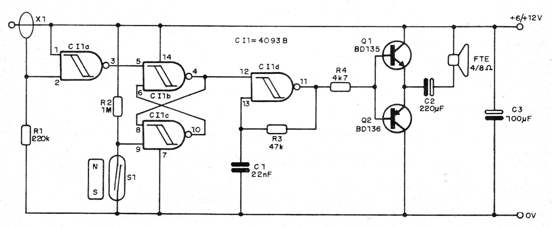 Un ligero toque del péndulo en la argolla dispara esta alarma que emite un sonido en un altavoz. La frecuencia del sonido depende de C1 y R3 y el rearme del circuito se hace aproximando un imán del reed-switch. El circuito puede ser alimentado por tensiones de 6 a 12 V.