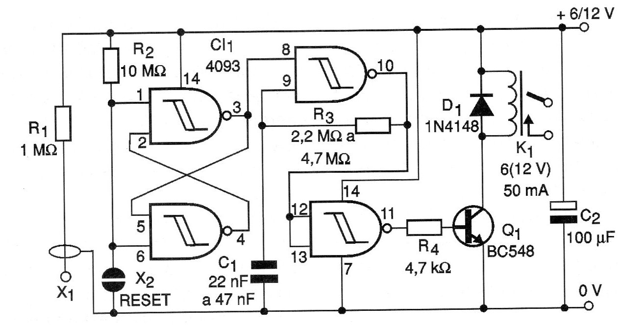 El circuito mostrado en la figura se dispara cuando un ligero balance hace que el péndulo toque el aro que lo rodea o si se utiliza un sensor de tacto cuando alguien se toca. El circuito emplea una configuración bautismal del 4093 de modo que, aunque el tacto del sensor dure una fracción de segundo, conmuta y así permanece indefinidamente con el relé siendo accionado de modo intermitente. Para rearmar el circuito es necesario tocar el sensor X2 por un instante. Si se utiliza un sensor de tacto simple, como un pedazo de metal o el circuito se conecta a un objeto, el punto de cero voltio debe ser conectado a tierra. La alimentación se puede realizar con pilas, batería o fuente. Si se utiliza una fuente, debe aislarse de la red de energía para que no se produzcan peligros de choque al tocar el sensor. El resistor R1 debe aumentarse a 10 M ohms si se utiliza el sensor de tacto. El resistor R3, junto con el capacitor C1, determina la intermitencia en el accionamiento del relé.