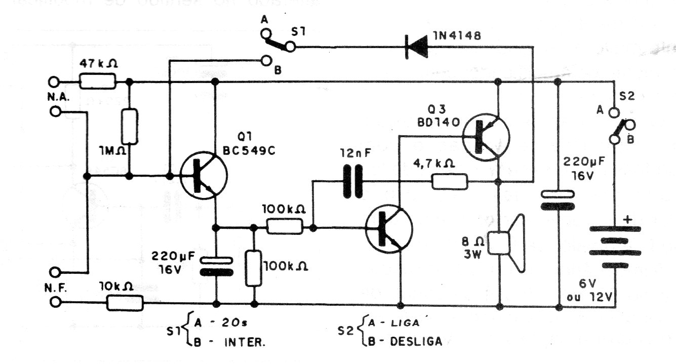 Este simple circuito consiste en un oscilador que puede ser activado tanto por la acción de sensores NA como NF. El transistor BD140 debe estar dotado de un disipador de calor. La alimentación viene de pilas grandes o de batería.