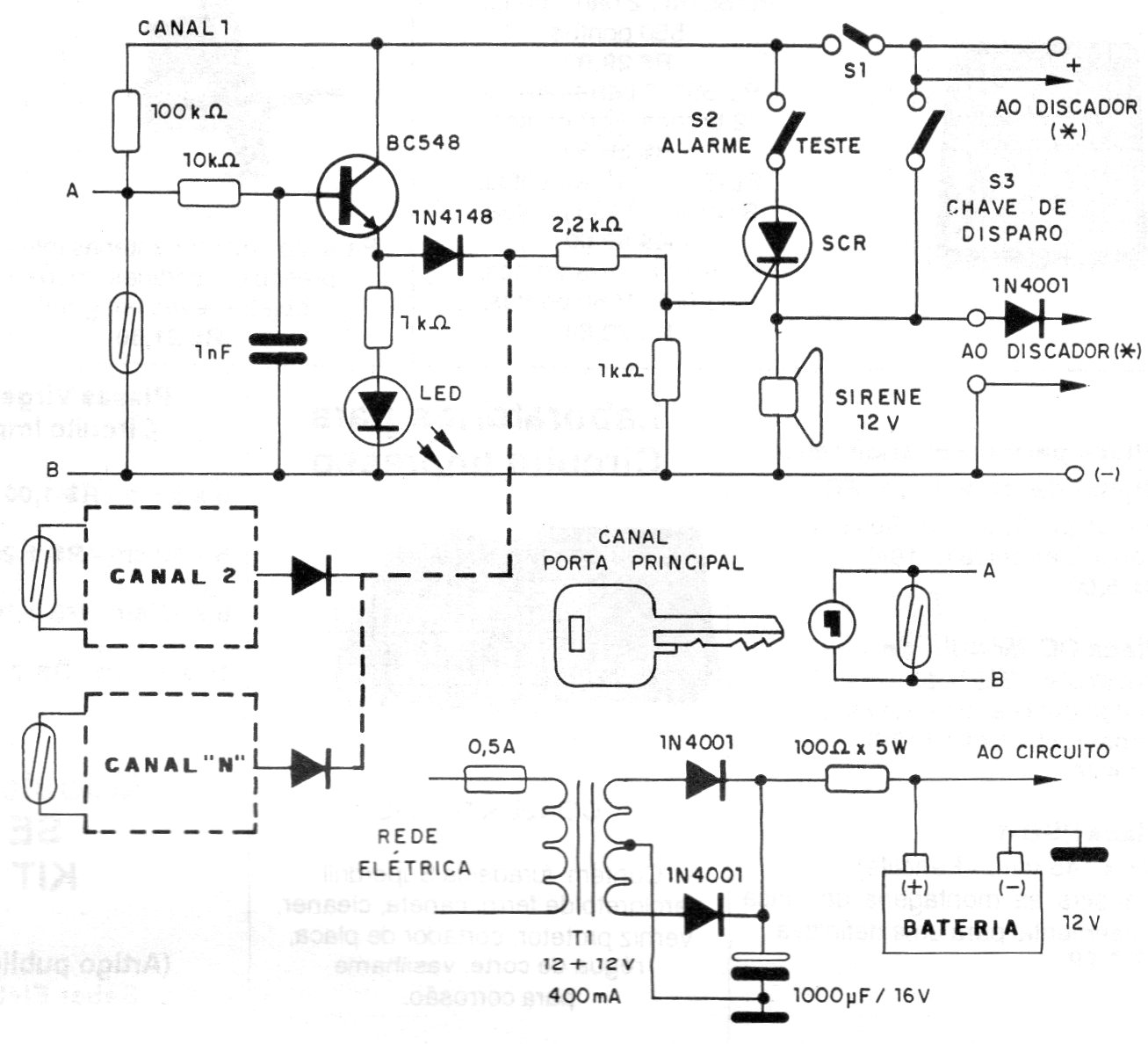 Este circuito con sensores tipo reed es bastante sencillo alimentando una sirena de 12 V cuando se dispara. El circuito tiene una fuente que mantiene una batería en carga constante para funcionar en el caso de cortes de energía y no tiene temporización. El circuito es de una documentación de 1995.
