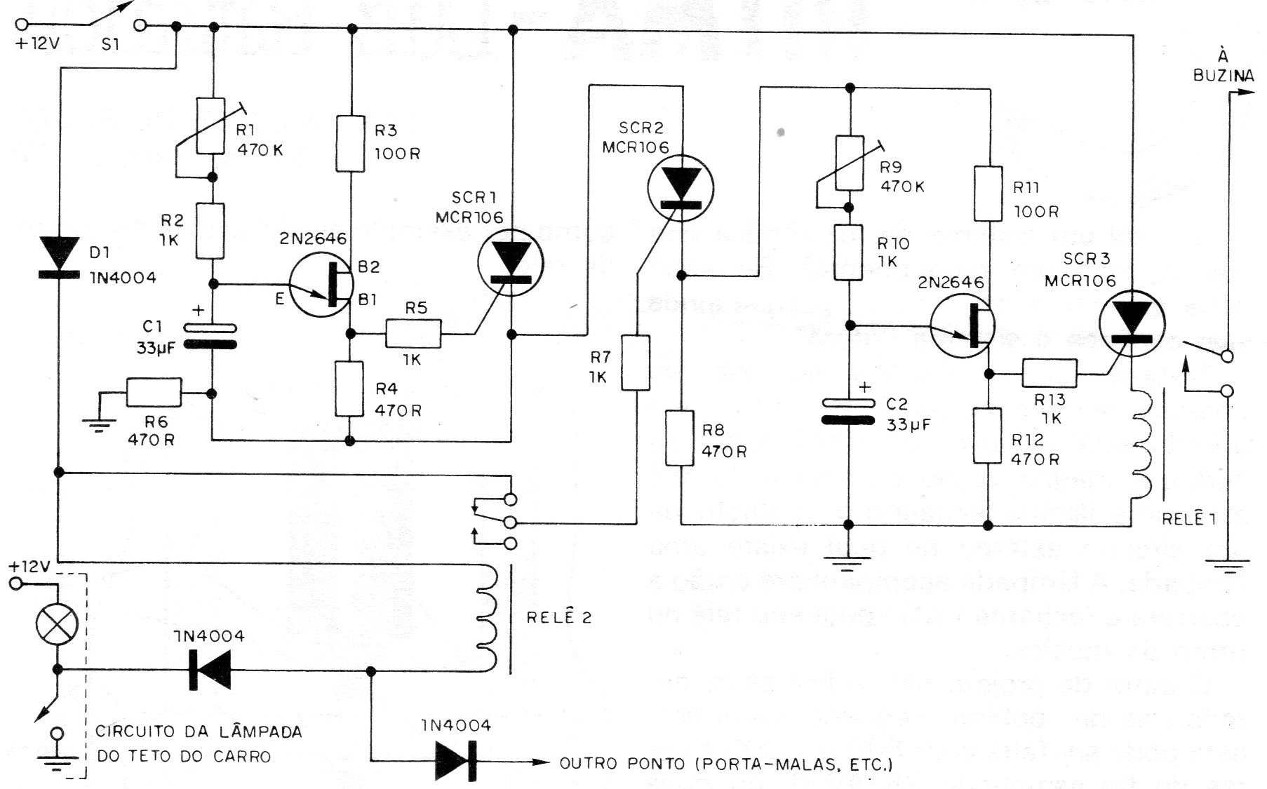 Este circuito fue obtenido en una publicación de 1982. Existen muchos tipos de alarmas para coche a disposición de los lectores, cada uno con características específicas, que significan mejor o peor desempeño. La elección de una alarma es difícil porque deben tenerse en cuenta las condiciones en las que el vehículo debe protegerse. La alarma que describimos aquí, por sus características, sin duda es de los mejores y puede satisfacer las necesidades del lector. Su funcionamiento es el siguiente: al salir del coche, el propietario acciona un interruptor (S1). Con el accionamiento de este interruptor tiene aproximadamente 20 segundos para salir del coche y cerrar la puerta. Después de eso, el primer oscilador emite un pulso que "arma" la alarma por el disparo del SCR1. Con el circuito armado se coloca en el circuito un segundo oscilador de espera. Si la puerta se abre ahora, este oscilador después de 20 segundos emitirá un pulso que disparará el tercer SCR, que es el eslabón final del circuito, conectado a la bocina. Estos 20 segundos corresponden al tiempo que el propietario tiene para abrir la puerta y desactivar la alarma.