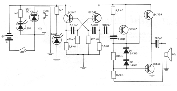 Esta alarma contra robos tiene una gran eficiencia, dependiendo evidentemente del cuidado con que se haga su instalación. El primer bloque es el sensor, que tiene por elemento básico un SCR. Este SCR es disparado por un interruptor de presión del tipo normalmente abierto, que queda instalado junto al objeto o paso a ser protegido. Una disposición mecánica debe ser imaginada por el montador para que este interruptor sea accionado por el intruso. La característica principal del bloque es que, usando un SCR, una vez disparado el circuito, aunque por un corto cierre del interruptor, él permanece indefinidamente, hasta que sea rearmado por CH1. El segundo bloque consiste en un oscilador de audio (un inyector de señales), que opera alrededor de 400 Hz y que es accionado por el SCR. La señal de este oscilador se lleva a un pequeño amplificador de audio, que proporciona una potencia de alrededor de 500 mW, pero que excita un altavoz con buen volumen. El circuito mostrado en la figura, se alimenta con una tensión de 6 V, que se puede conseguir de 4 pilas pequeñas o medianas.