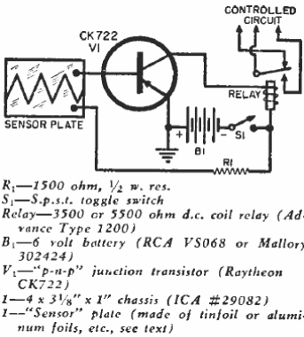 Este circuito bien conocido de muchos fue sugerido por el manual de uso del CK722 de la década de 1950 de Raytheon. El CK722 fue el primer transistor comercial del mundo. El relé debe ser de acuerdo con la tensión de la batería y el tipo de baja corriente 20 mA, pues el CK722 era muy "flaco"!