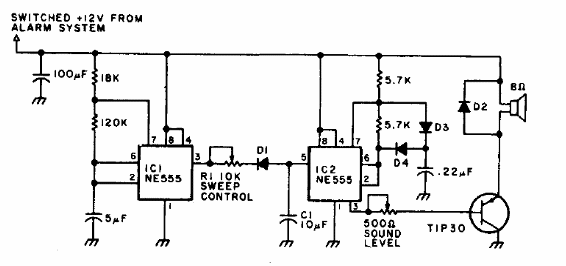 Encontramos este circuito en una publicación de 1976. El circuito puede ser montado con transistores como el TIP31 o TIP32. Los capacitores y resistores de tiempo se pueden cambiar para modificar el sonido. El altavoz debe tener buen rendimiento.