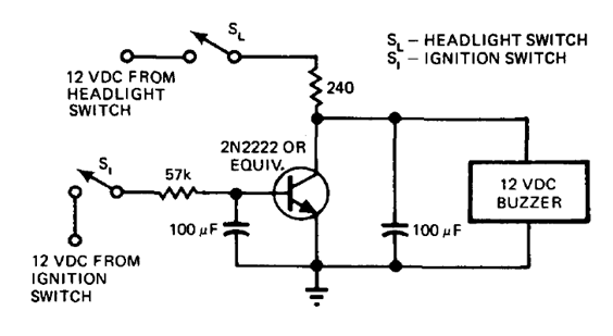Este circuito consiste en un recordatorio para conductores que dejan los faros encendidos y el coche no tiene el recurso de avisarle. El circuito es de una publicación de 1975 y el bocadillo es del tipo que posee oscilador interno como el Sonalert.