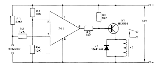 El sensor puede ser formado por electrodos enterrados o incluso pantallas de metal con un tejido entre ellas. La resistencia R1 determina la sensibilidad, pudiendo tener valores típicamente entre 100k y 8,2 M. Los valores más altos implican en mayor sensibilidad. La tensión de alimentación debe elegirse según el relé y no se debe utilizar una fuente simétrica. El relé tiene una bobina de un máximo de 50 mA y amplificadores operacionales y se pueden emplear comparadores equivalentes.