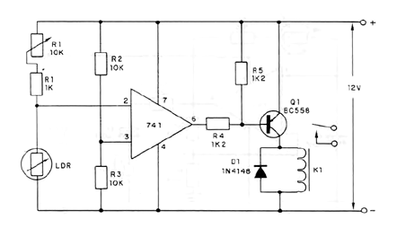 Este circuito acciona un relé cuando la luz deja de incidir en el sensor. Puede ser utilizado como una alarma de paso produciendo un pulso por el relé o como interruptor crepuscular. La fuente de alimentación no necesita ser simétrica y su tensión debe ser de acuerdo con el relé utilizado. El ajuste del punto de disparo se realiza en el potenciómetro de 10 k. Para mayor sensibilidad monte el LDR en un tubo con lente y aumente el trimpot a 100k. Se pueden utilizar otros operacionales.