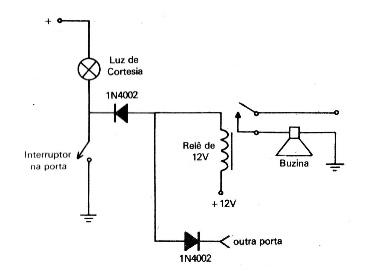 Esta alarma simple aprovecha los interruptores de la luz de cortesía de las puertas de los coches. Cuando la puerta se abre la alarma se dispara accionando la bocina. Las mejoras se pueden realizar para que el sistema no tenga un disparo indebido.